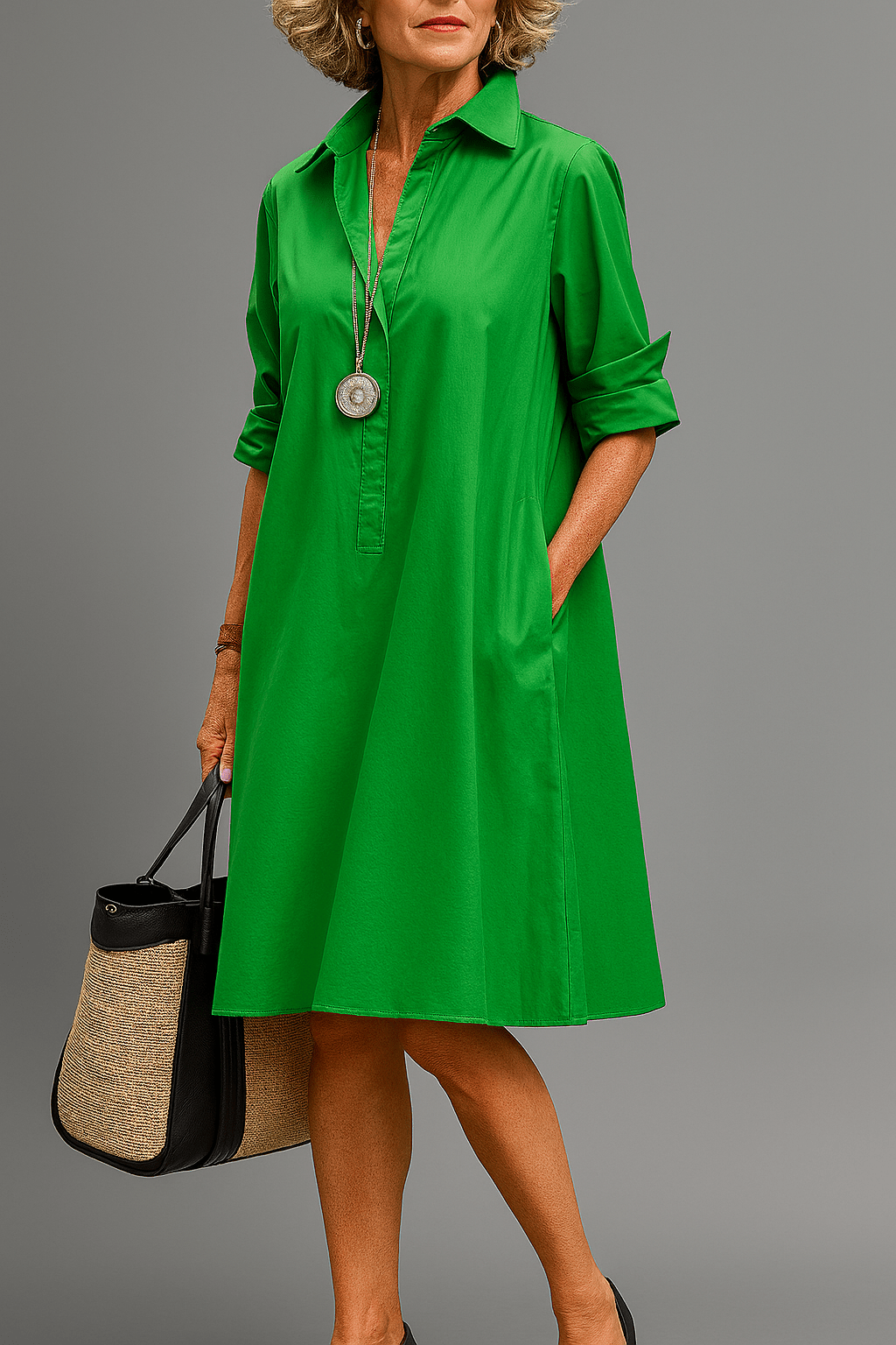 Astrid | Smaragd midi-kjole udstråler klassisk elegance og diskret selvtillid. Kjolen præsenterer en tidløs silhuet i en dyb smaragdgrøn nuance og et udsøgt snit, der giver et look, der aldrig går af mode. Den strukturerede skjortekrave, frontknapperne og det let A-formede skørt fremhæver taljen og flatterer kroppen uden unødvendig pynt. Enkel, raffineret og uforglemmelig – Astrid er resultatet af omhyggeligt håndværk og varigt design, som tilfører garderoben en lang levetid og en følelse af eksklusivitet, der står tidens prøve.