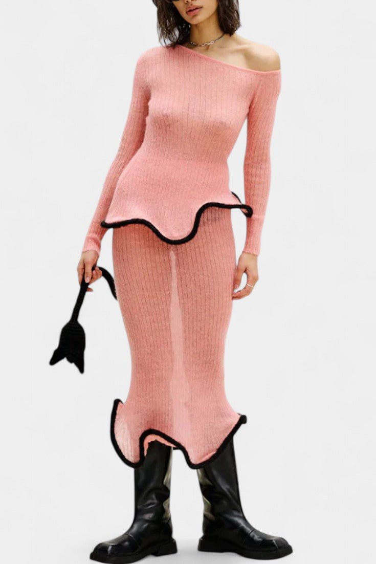 Emma | Langærmet Stormi er en sofistikeret sammensætning, der forener femininitet og mod i en ligefremt elegant balance. Den ribstrikkede overdel kysser én skulder, mens det halvtransparent midi-skørt skaber en legende, raffineret silhuet. Hvert materiale og hver søm vidner om håndværkets præcision og omtanke; en diskret spejlfinish tilføjer lysende refinement og taler til modellens oprindelseshistorie og tidløse kvalitet. Den lyserøde nuance tilfører varme og modernitet, og Stormi fremstår som et tidløst objekt for den bevidste garderobe og for samlere, der søger sjældne, veludførte stykker. Med begrænset oplag og udvalgte materialer repræsenterer Stormi en investeringsværdi, der taler til moderne stil gennem sæsoner og årstal.