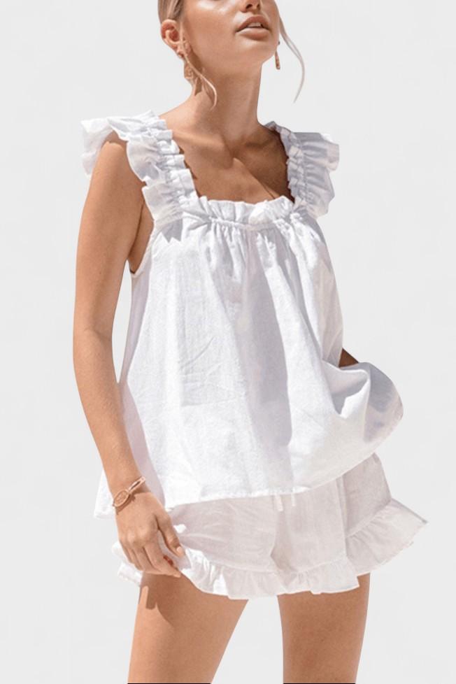 • Design og silhuet: Flæser på toppen og flæsekant på shorts skaber en let, feminin silhuet.
