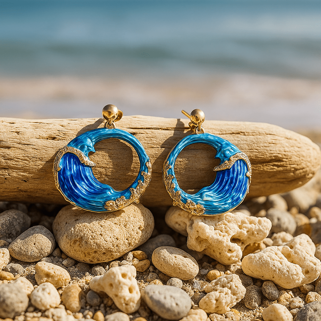 Mette | Håndmalede øreringe er en hyldest til havets bevægelser og til tidløs elegance. Hver bølge er håndskåret og malet i dybe blå nuancer, indrammet af subtile gyldne detaljer, der minder om skummet ved kysten. Dette maritime kunstværk fanger energi, ynde og styrke og bærer sin historie videre gennem generationer og særlige begivenheder. Håndmalet emaljeret messing, fuldstændig dekoreret med gyldne mikrokristaller, forenes med små håndlavede kvartssten, der giver naturligt spil og unik glans. Materialerne er hypoallergeniske med lavt nikindhold, lette og behagelige at have på — ideelle for dem, der ønsker at bære et kunstværk af havet. Begrænset produktion sikrer holdbar værdi og en tidløs appel for samlere.