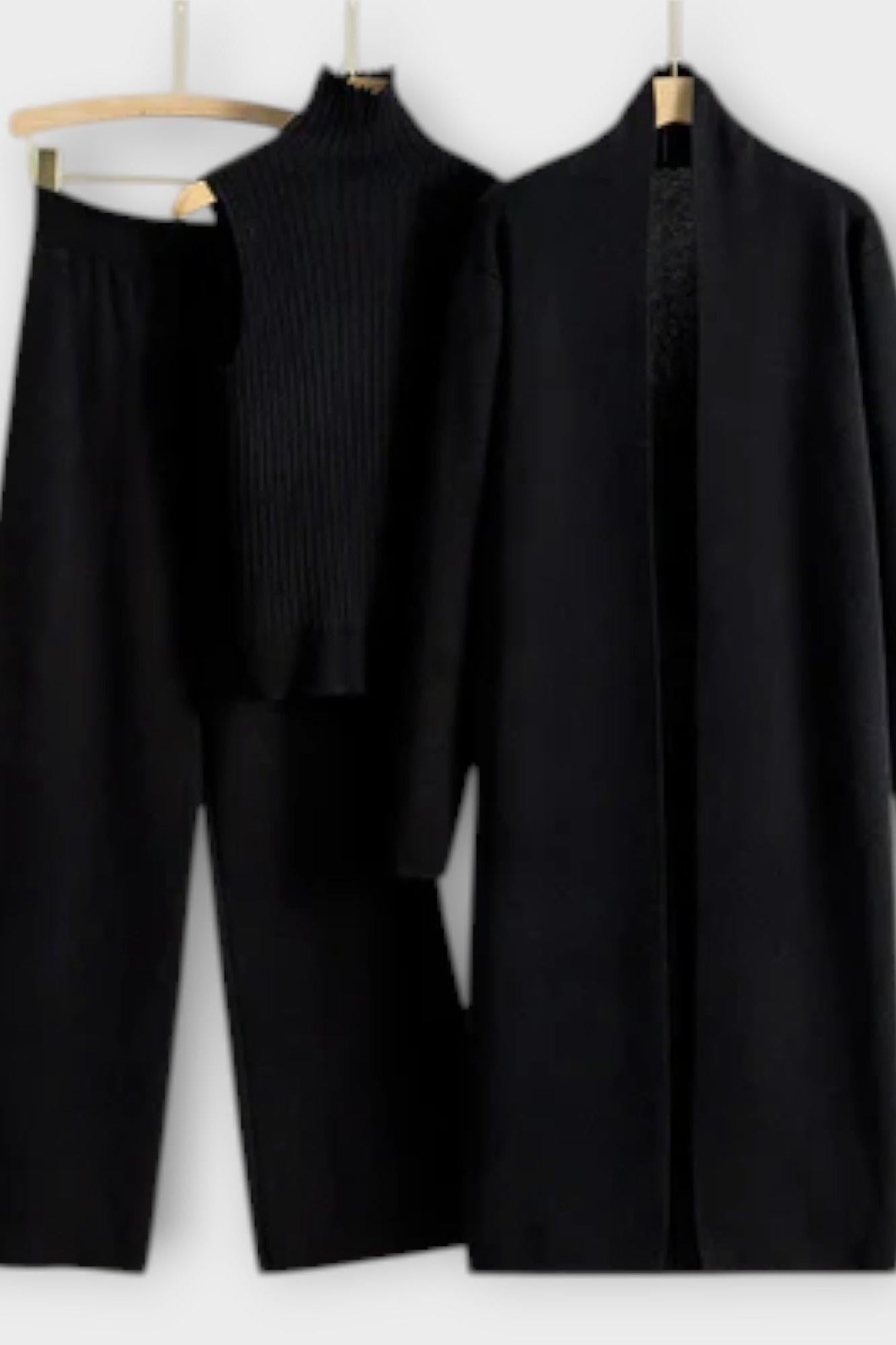 Stine | Ribstrikket sæt udstråler tidløs luksus gennem håndværk af høj kvalitet. Settet væver i fin ribstrik, der giver varme, elegant drapering og en behagelig pasform. Består af tre dele — lige bukser, en højhalset top uden ærmer og en lang knapfri jakke — som kan bruges samlet for et harmonisk look eller lag-på-lag for maksimal fleksibilitet. Den minimalistiske, raffinerede form giver tidsløs værdi og en ægte samlerappel. Begrænset tilgængelighed styrker sætets eksklusivitet og investeringsværdi.